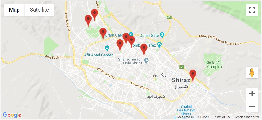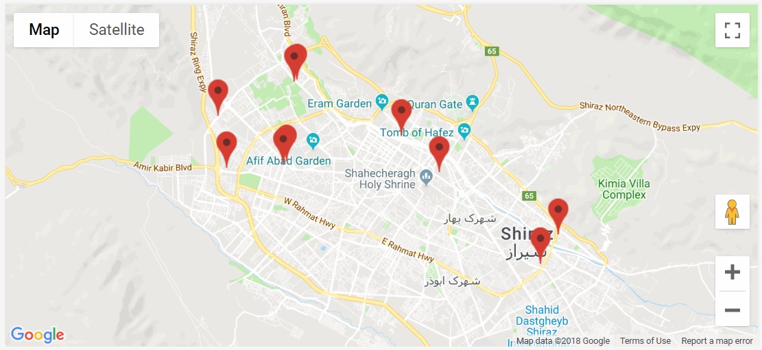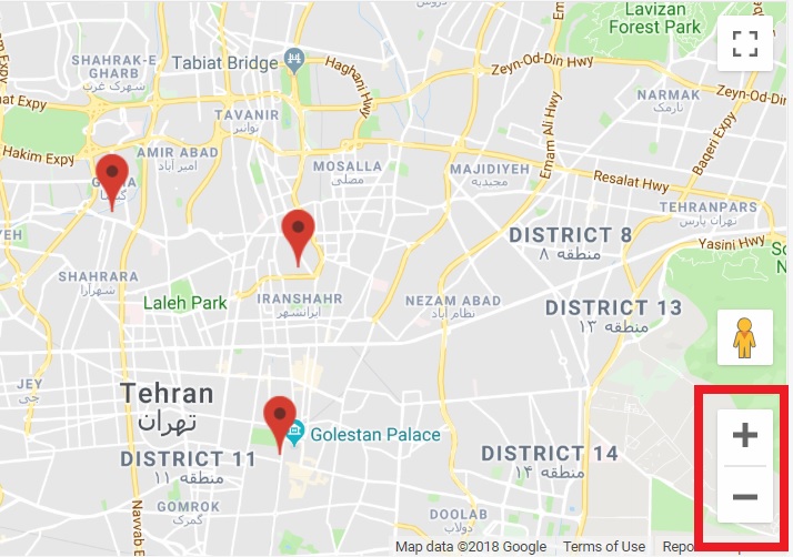 نکته مهم 5 : در برخی از کلان شهر ها ، بخاطر بزرگ بودن محدوده شهری ، گاهی همه محدوده شهر یا همه 30 مورد موقعیت مکانی ، همزمان مشاهده نمی گردد. لذا مجبور هستیم با علامت مثبت یا منفی ( با دو انگشت در موبایل ) ، نقشه محدوده قابل مشاهده در تصویر را ، بزرگ و کوچک کنیم.