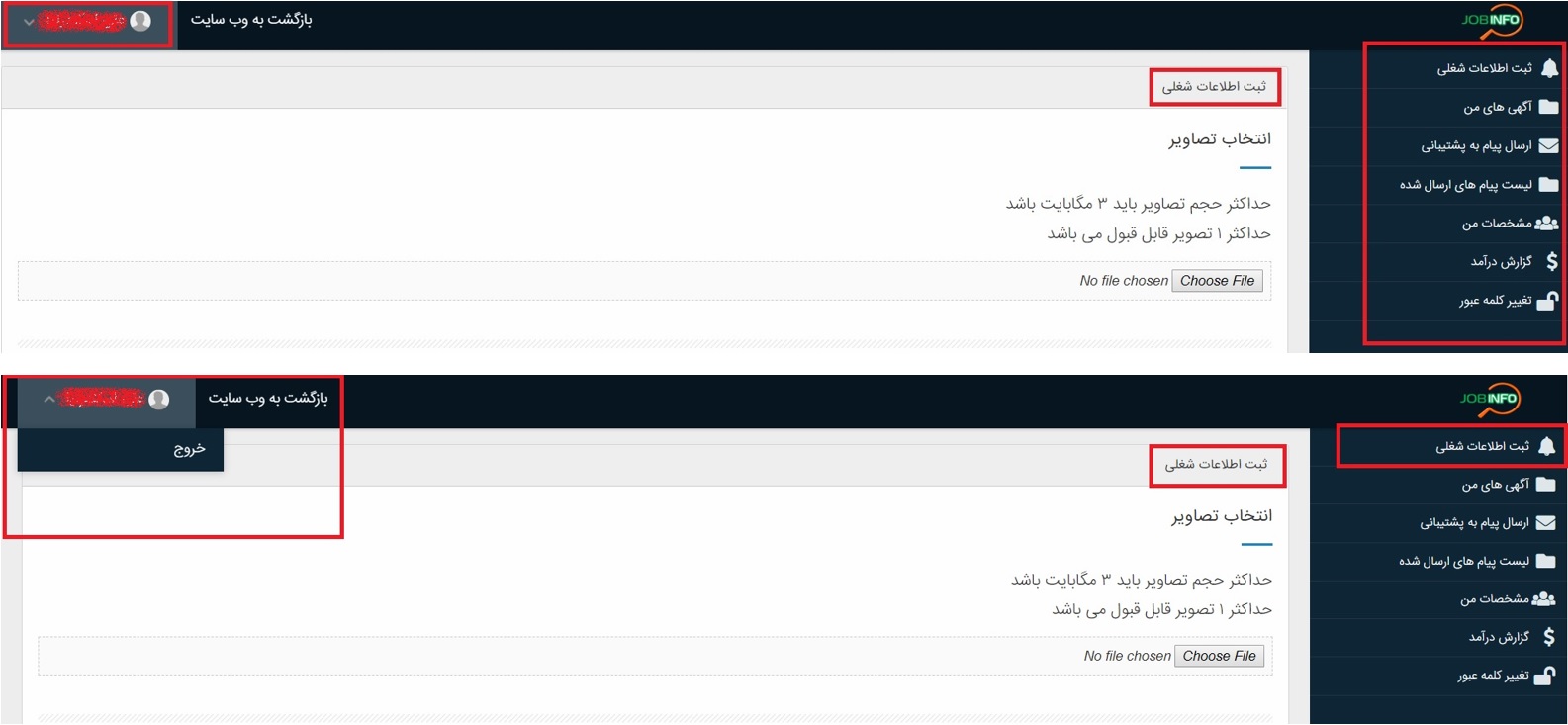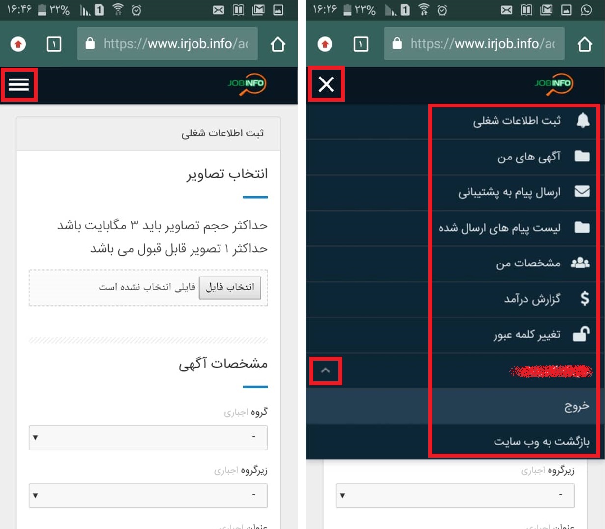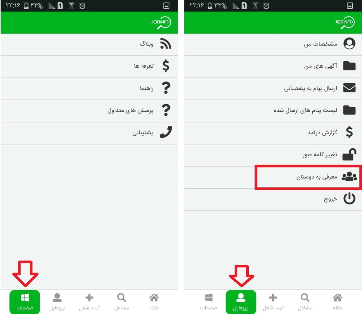 الف . پس از نصب اپلیکیشن کم حجم و پر کاربرد جاب اینفو ، ابتدا باید عضو شوید که مراحل عضویت در بخش های قبل به طور کامل شرح داده شده است. و سپس به محیط کاملا راحت و روان آن وارد می شوید. در اولین بخش آن شما به بخش صفحات وارد می شوید که دسترسی های کاربر به / پشتیبانی / وبلاگ جاب اینفو ، که مطالب مفید و خوبی را در اختیارتان قرار می دهد / سوالات متداول / راهنمای سایت / تعرفه ها / را میسر می نماید.