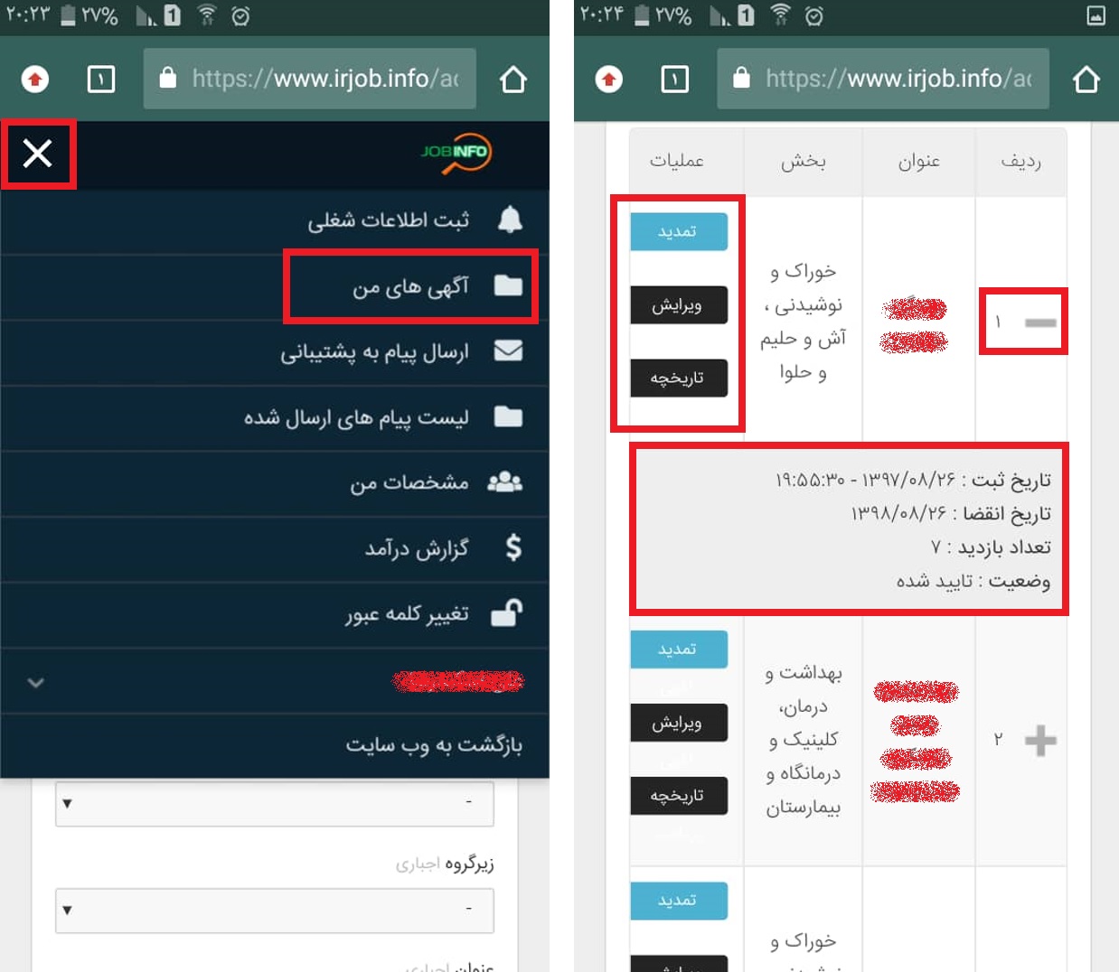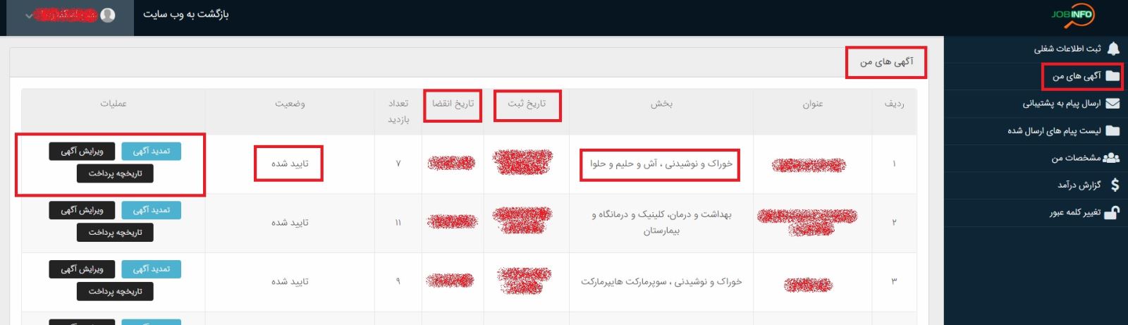 در بخش بعد قسمت ( آگهی های من ) را مشاهده می کنید که تعداد آگهی های ثبت شده توسط شما را نشان می دهد و اطلاعات هر کدام را در اختیار شما گذاشته است و در نهایت ، بخش عملیات است که شامل سه زیر مجوعه / تمدید آگهی / ویرایش آگهی / تاریخچه پرداخت / است. بدیهی است که هر آگهی ثبتی ، شامل اطلاعات مربوط خود می باشد.