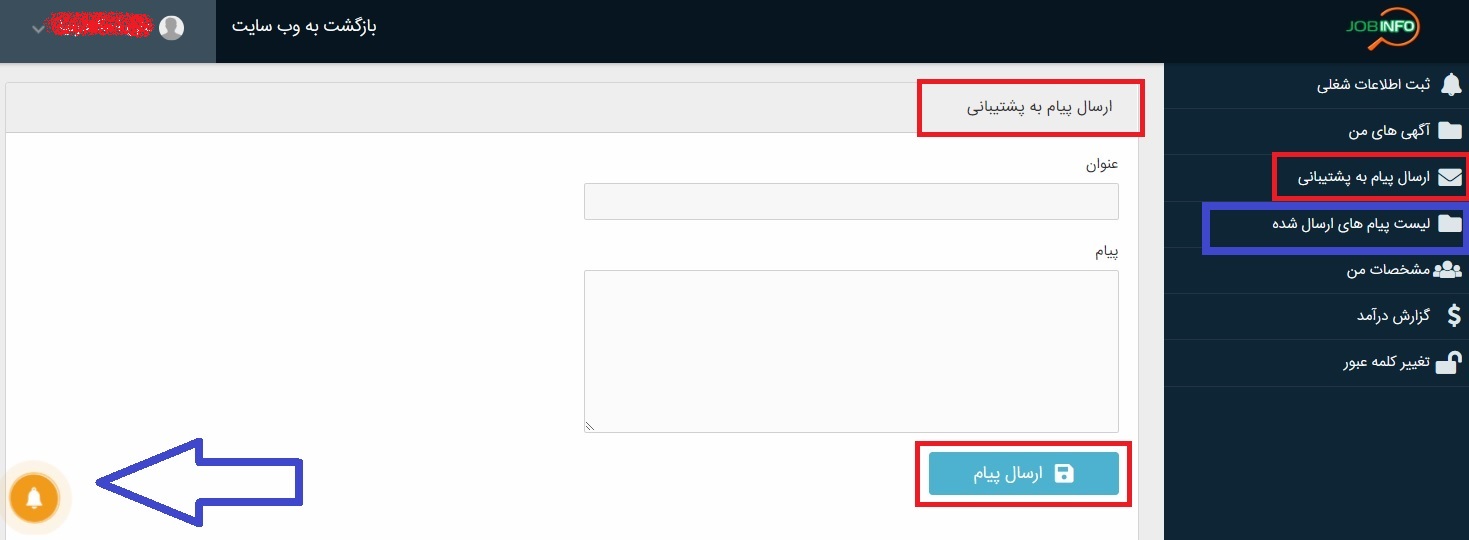 در بخش بعد قسمت ( ارسال پیام به پشتیبانی ) را مشاهده می کنید که با رنگ قرمز مشخص شده و جهت مکاتبه فوری میان شما و پشتیبانی می باشد . همچنین پیام های دریافتی از پشتیبانی به شما که به شکل یک زنگوله طلایی رنگ برای شما ظاهر می شود و به شما می گوید که از سمت پشتیبان برای شما پیامی ارسال شده است. و در چنین شرایطی ، شما باید روی زنگوله فشار داده یا به صورت مستقیم به بخش ( لیست پیام های ارسال شده ) مراجه کرده و پیام های ارسالی را مطالعه فرمایید.
