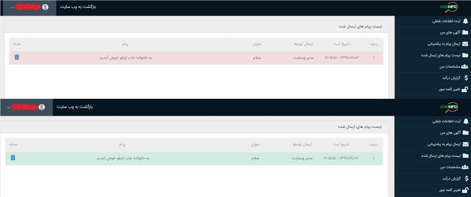 پیغام هایی که یکبار خوانده شده است ، به رنگ سبز در می آیند و زمانی که شما به پیام های قرمز رنگ بر میخورید ، به معنی دریافت پیغام جدید از طرف پشتیبانی می باشد. و پس از مطاله آن ، پیغام به رنگ سبز تبدیل خواهد شد. پیشنهاد می شود پس از مطالعه پیغام دریافتی ، به جهت شلوغ نشدن صفحه در آینده ، پیغام را حذف کنید.