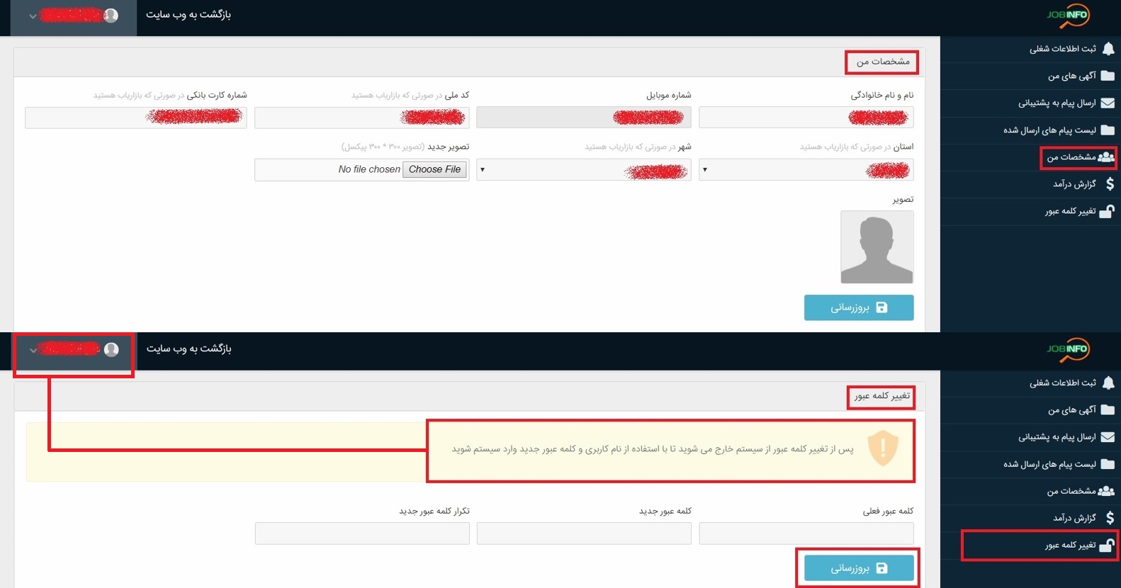 در انتها نیز دو بخش ( مشخصات من ) و ( تغییر کلمه عبور ) وجود دارد که اسم هایشان کاملا گویای عملکرد آنها است. پیشنهاد می شود هر زمان که احساس کردید کسی از کلمه عبور شما مطلع شده است یا ممکن است به راحتی متوجه آن شوند ، آن را تغییر دهید.