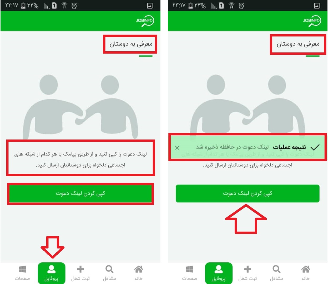 ب . در بخش دوم شما وارد پروفایل یا پنل شخصی خود می شوید که توضیحات آن در قسمت های قبل به طور کامل بیان شده است. با این تفاوت که بخش ( معرفی به دوستان ) اضافه شده است. این صفحه برای ارسال لینک دعوت جاب اینفو ، به دوستان و آشنایانتان به راحتی هرچه تمام تر است. دکمه سبز را فشار دهید ، پس از ذخیره شده لینک در محل مورد نظرتان کپی کنید.