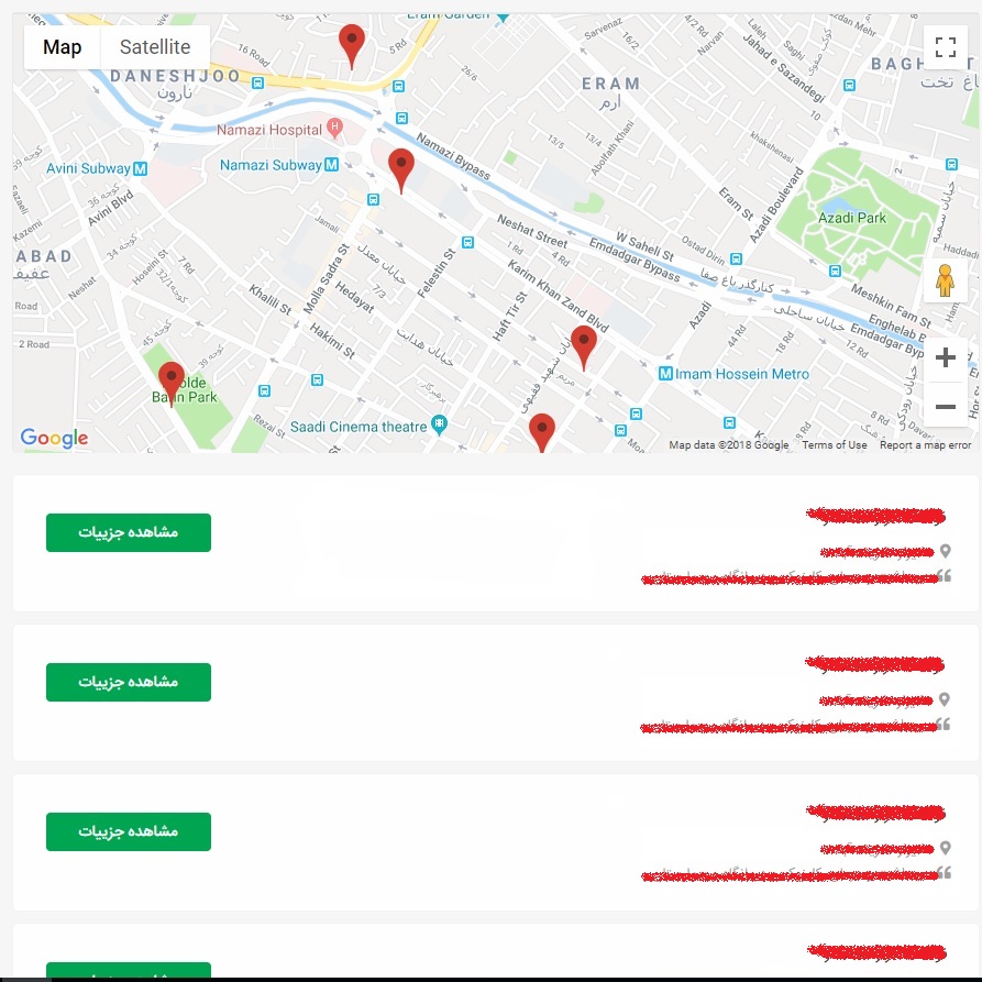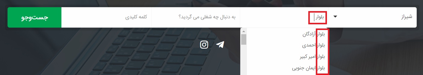 بخش دوم ، یک محله یا یک مطقه از شهر مربوطه انتخاب می شود که سیستم مجدادا با تایپ اولین حرف از یک محله ، محله یا مناطقی را به شما معرفی می کند که با آن حرف تشکیل شده باشد. این بار شهر شیراز را مثال خواهیم زد.( محله می تواند اختیاری باشد و شما با خالی گذاشتن آن کل شهر را مشاهده خواهید نمود )