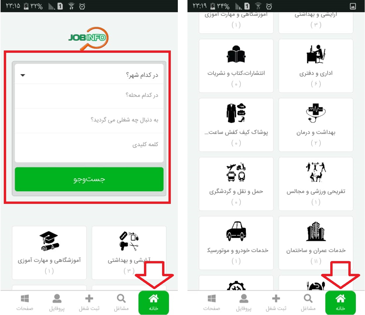 د . در بخش آخر شما وارد کاربردی ترین قسمت اپلیکیشن جاب اینفو می شوید که موتور پر قدرت جستجو قرار دارد ، در مورد موتور جستجو به طور مفصل در فصل دوم و مورد استفاده بهینه از آن صحبت کردیم . همین طور در بخش زیرین موتور جستجو ، دامنه دسته بندی های کلی مشاغل و اصناف موجود در جاب اینفو مشخص هستند.