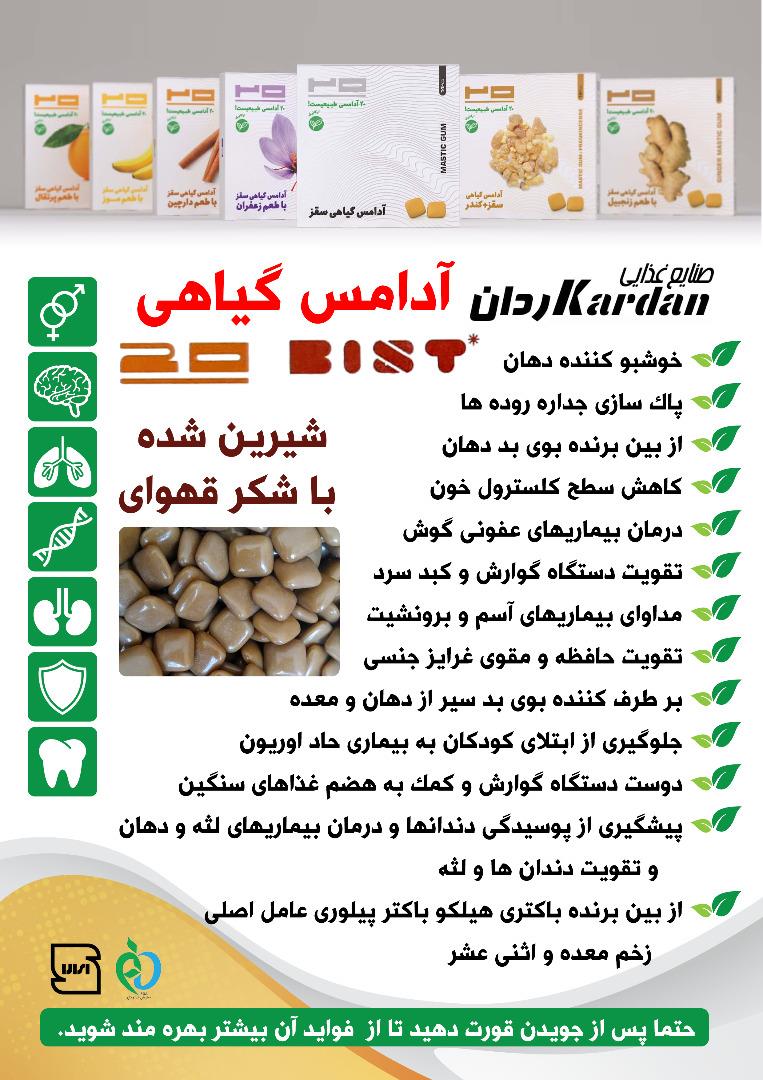 در طعمهای آدامس سقز ساده-آدامس سقز با کندر وآدامس سقز زنجبیلی،آدامس سقززعفرانی،آدامس سقزپرتقالی،آدامس سقز موزی،آدامس سقز دارچینی بصورت بسته ای و کارتنی